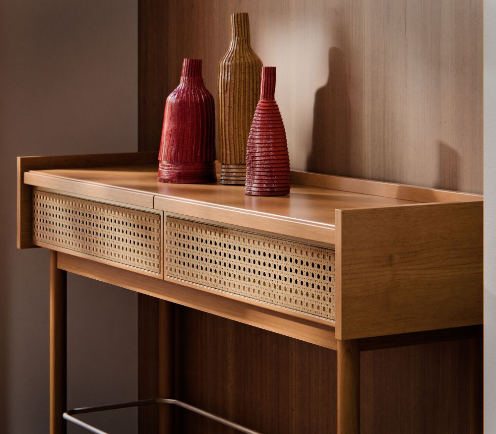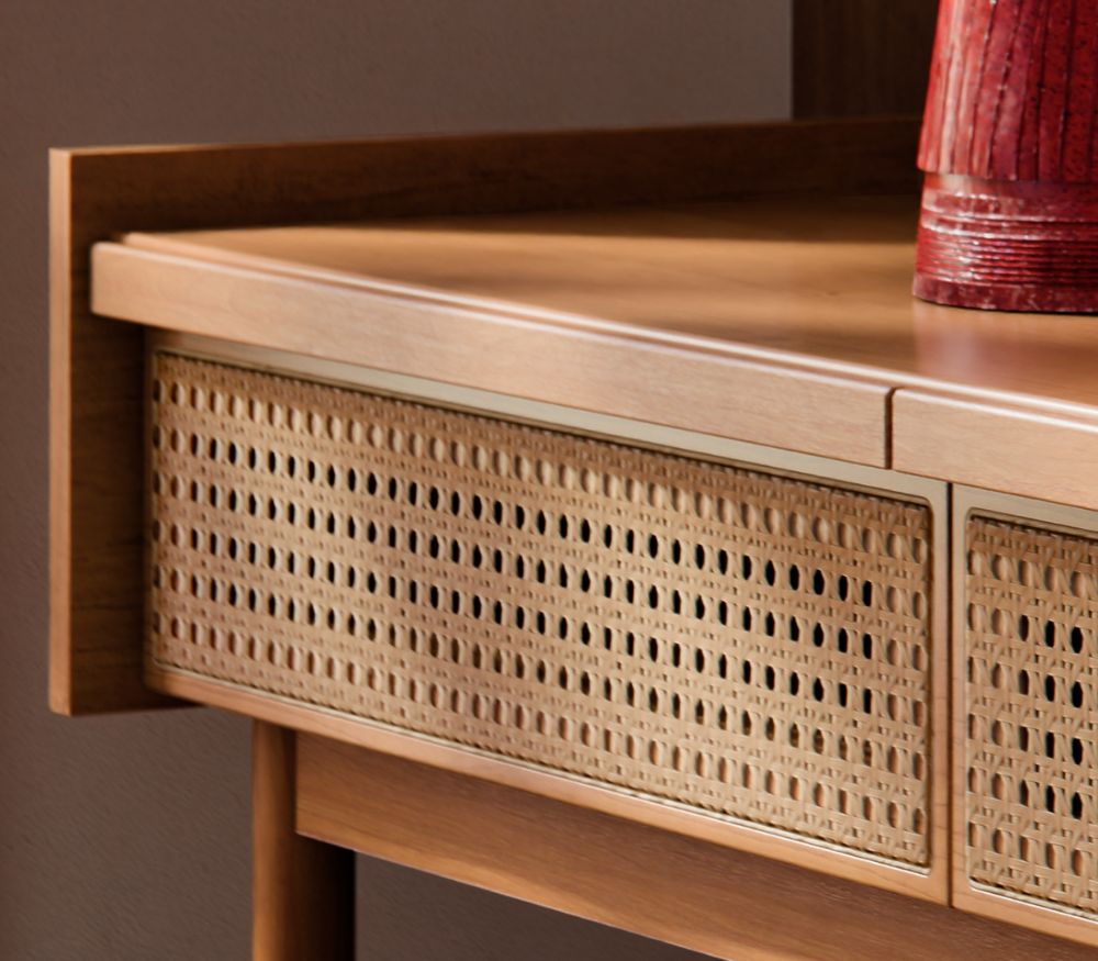 - Base, pés e puxadores em madeira maciça