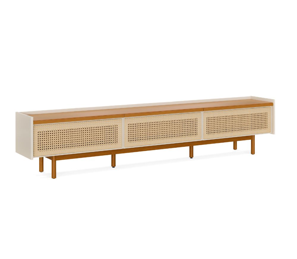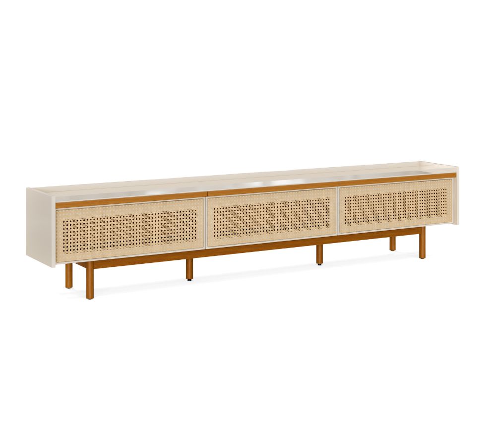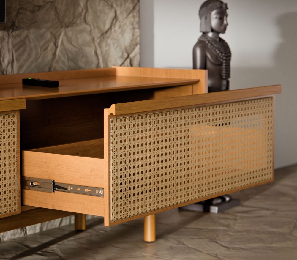 - Base, pés e puxadores em madeira maciça